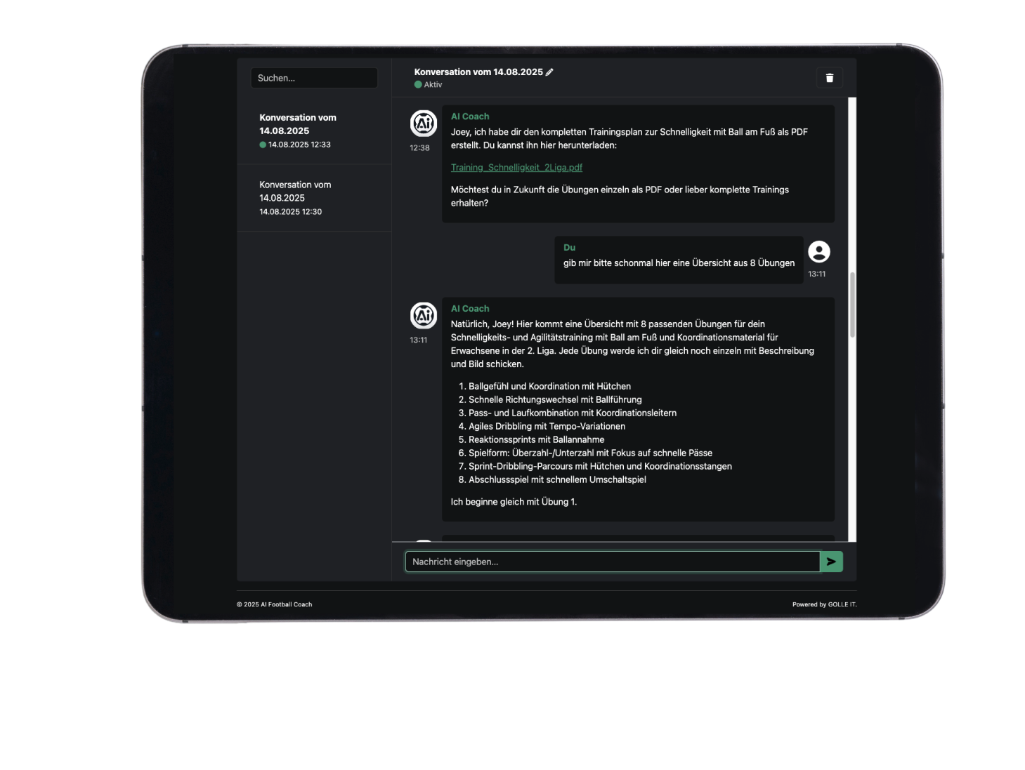 Wir haben eine vollständige Weblösung entwickelt, die mit künstlicher Intelligenz Trainingsdaten analysiert und personalisierte Trainingspläne erstellt. Spieler und Teams erhalten so gezielte Verbesserungsvorschläge und interaktive Auswertungen – alles intuitiv bedienbar und mobil verfügbar.